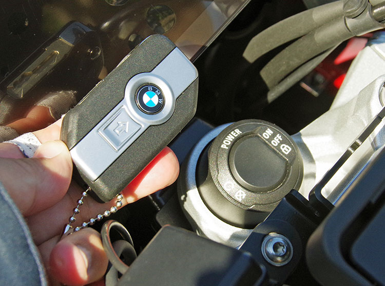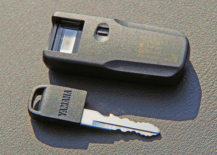 車両側にキーシリンダーを持たずに電波信号を読み取ることでエンジンスタートできるようになるキー。エンジンスタート時の操作は、プッシュボタンを押したりレバーやノブを回したりと様々です。アンサーバックやシートロックの解除などリモコン機能を持つものもあります。下写真はヤマハTMAX560のもの。なお、スマートキーはスペアが付属しないことが多いので、なくさないように注意。