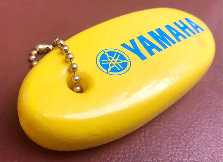 鍵は細くて小さいので、落とした時に溝や隙間に落ちやすいです。これを防ぐために大き目のキーホルダーをつけておきます。とにかく、溝に鍵が落ちていかないための工夫です。上写真はヤマハのマリン(船)用の水に浮くキーホルダー(発泡ウレタン製)です。