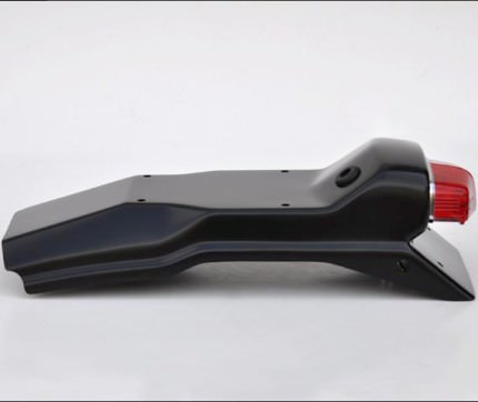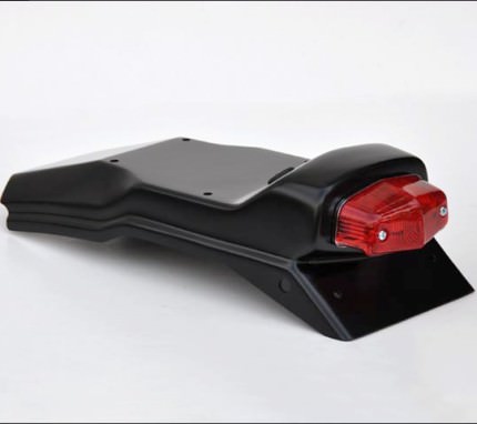 ヤマハTW用フェンダーレスキットのバリエーションモデル。テールランプは小振りでスタイリッシュなルーカスSタイプがセットされています。本体はFRP製、表面は艶のある黒ゲルコート、裏面黒塗装仕上げ。ウインカー取り付け穴(10mm)が用意されており、好みのウインカーとステーを装着することができます。取り付けに必要なステーやビス類も付属し、ボルトオン設計。ノーマルシートは装着不可となります。配線穴はゴムのグロメットにて保護されています。