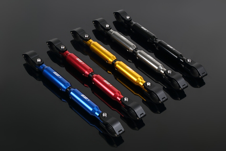 ※長さはクランプ時の長さとなります。※商品画像はイメージです、商品の仕様と異なる場合もあります。※製品の価格は改良の為、予告無く変更することがございます。アルミ製にカラーアルマイト処理を施し、高級感を実現。センターバーが22.2mmのハンドル径なので、ドリンクホルダーやETC取付ステーが装着可能。アジャスター式でセンターバーの長さが225mm〜330mmまで調節可能。(画像をご参照ください)クランプ部はヒンジ式で開閉するので、ハンドルにも簡単装着可能。ハンドル強度の向上だけでなく、ドレスアップパーツとしても効果的。