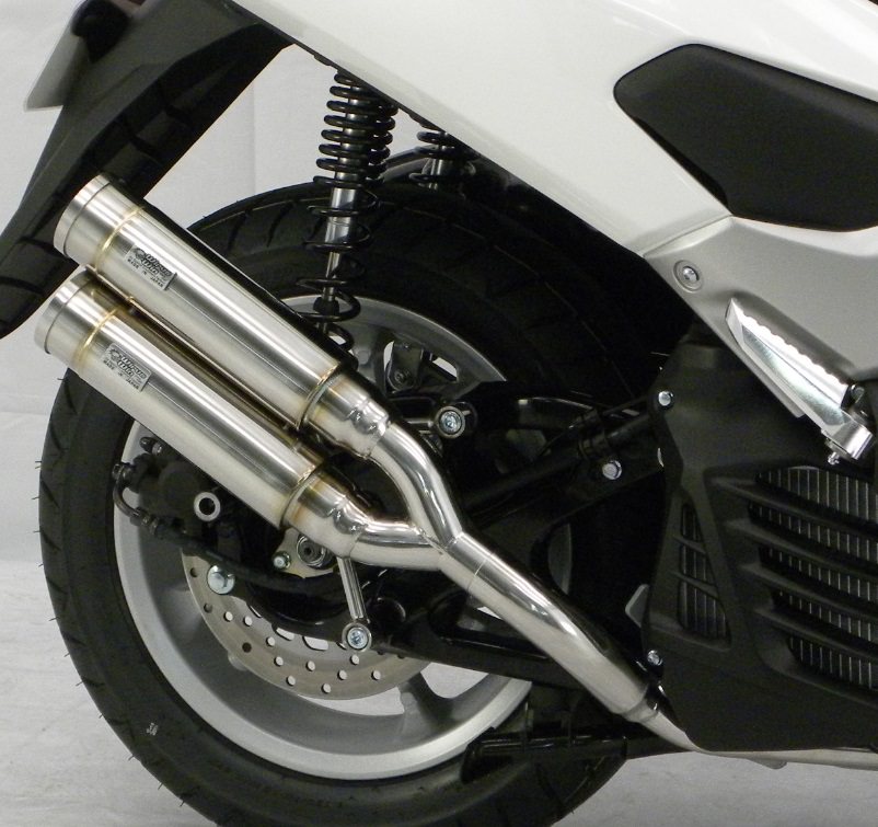 ※受注生産商品のためご注文後商品のお届けまで2週間程度お時間を頂戴いたします。※平成22年4月1日より施行された認証制度に適合する認証マフラーではありません。ご理解の程よろしくお願い致します。※車体型式:EBJ-SE86J/エンジン型式:E3P8E に適合します。2本出しタイプマフラーは発売以来大好評で、いまだ人気が衰えず絶好調です。アトミックツインマフラーは、ビックスクーター界で主流になりはじめたサイレンサーを短くした、最先端のドレンドマフラーです。極端に派手すぎずできるだけシンプルに自然なラインをイメージして制作しました。サイレンサーをできるだけ短くとり、車体のラインに調和させました。たくさんのお客様からの意見を取り入れて、あらゆるカスタムに似合うよう高級感が高く、かつシンプルなイメージでデザイン、製作いたしました。他社には無い時代を先行く2本出しマフラーが完成しました。バッフル(消音用のパーツ)を標準装備2種類の音量が選択可能バッフル両方装着時:排気音量 約 87dbバッフル片側装着時:排気音量 約 89dbバッフル非装着時:排気音量 約 91db