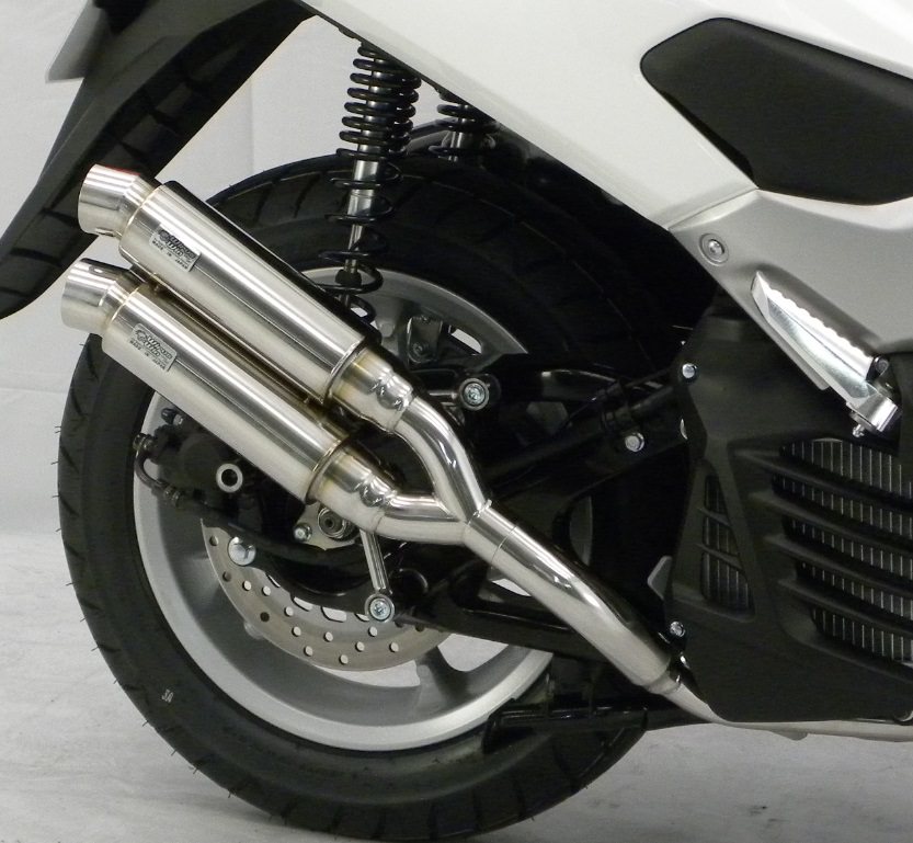 ※受注生産商品のためご注文後商品のお届けまで2週間程度お時間を頂戴いたします。※平成22年4月1日より施行された認証制度に適合する認証マフラーではありません。ご理解の程よろしくお願い致します。※車体型式:EBJ-SE86J/エンジン型式:E3P8E に適合します。2本出しタイプマフラーは発売以来大好評で、いまだ人気が衰えず絶好調です。アトミックツインマフラーは、ビックスクーター界で主流になりはじめたサイレンサーを短くした、最先端のドレンドマフラーです。極端に派手すぎずできるだけシンプルに自然なラインをイメージして制作しました。サイレンサーをできるだけ短くとり、車体のラインに調和させました。たくさんのお客様からの意見を取り入れて、あらゆるカスタムに似合うよう高級感が高く、かつシンプルなイメージでデザイン、製作いたしました。他社には無い時代を先行く2本出しマフラーが完成しました。バッフル(消音用のパーツ)を標準装備2種類の音量が選択可能バッフル両方装着時:排気音量 約 87dbバッフル片側装着時:排気音量 約 89dbバッフル非装着時:排気音量 約 91db