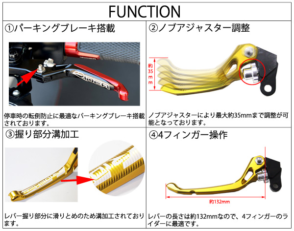 純正のブレーキマスターシリンダーに装着できます。高強度アルミニウム合金素材6061を精密加工したレバー本体にアルマイト処理を行うことにより高級感を与え、高精度を実現しました。停車時の転倒防止に最適なパーキングブレーキ搭載レバー前面部分には滑り止めの溝加工を施し、操作の安全性を高めます。ノブアジャスターにより最大約35mmまで調整が可能となっており、好みのレバー位置にセッティング可能です。