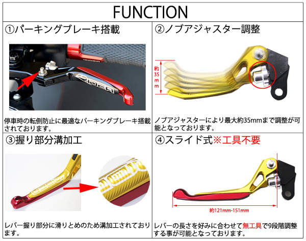 ※取り付け車種により純正レバーに付属する部品をご使用いただく場合がございます。※レバー交換後は必ず異常が無いか確認を行ってください。※モニターの環境等の理由により画像の色と実物の色が若干異なって見える場合がございます。※画像はイメージです。※この商品は予告なしに価格や仕様を変更する場合がございます。レバー本体カラー:ゴールドレバー長さ:(約)121-151mm(FUNCTIONの画像をご参照ください※取り付けた際の角度によって長さに若干の誤差が生じます)純正のブレーキマスターシリンダーに装着できます。高強度アルミニウム合金素材6061を精密加工したレバー本体にアルマイト処理を行うことにより高級感を与え、高精度を実現しました。停車時の転倒防止に最適なパーキングブレーキ搭載レバー前面部分には滑り止めの溝加工を施し、操作の安全性を高めます。ノブアジャスターにより最大約35mmまで調整が可能となっており、好みのレバー位置にセッティング可能です。レバーエンド部は延長式になっている為、最大約30mmの9段階調整が可能です。※工具不要レバーエンド部のエクステンションカラーは(ブラック|ゴールド|シルバー|ブルー|レッド|チタン|グリーン)よりご選択いただけます。