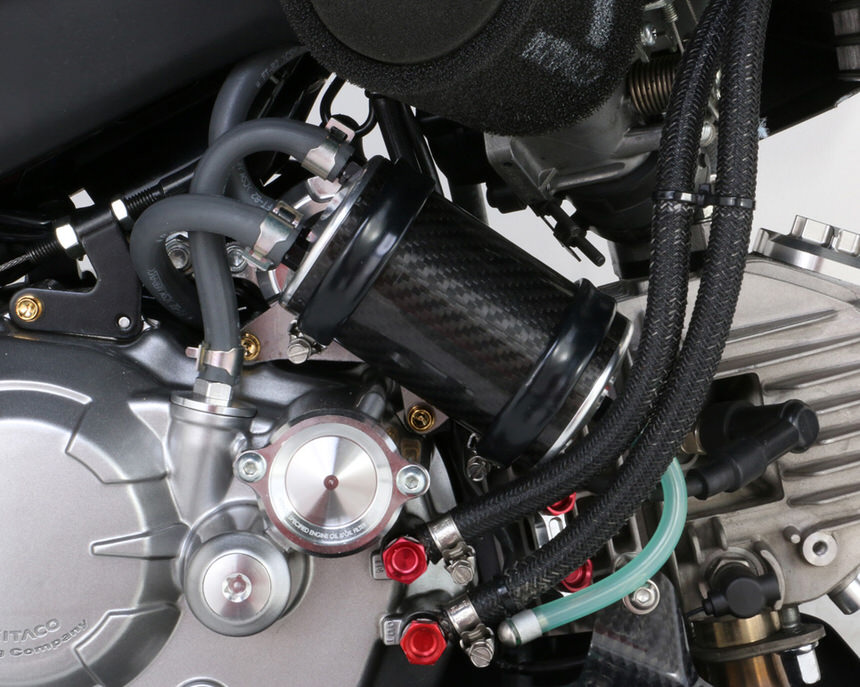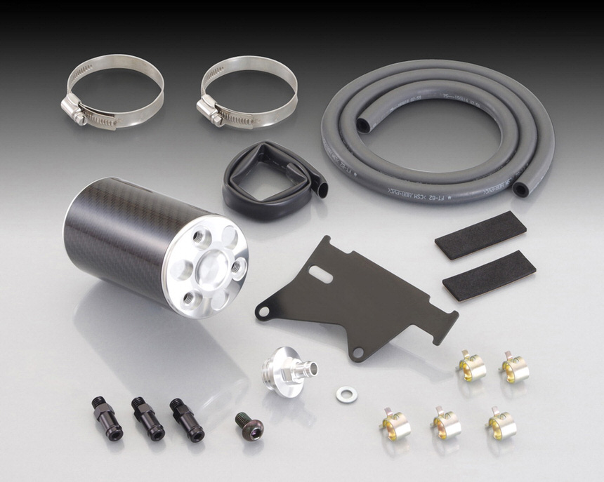 ピストン運動の妨げとなるケース内部の圧力をケースブリーザーから取り出し、パワーロスとクランクケース内の温度上昇を低減します。同時に吹き出るオイルをキャッチタンクが確実に受け止め圧力のみを大気放出させます。キャッチタンクボトル:アルミ製カーボン巻 ボトルキャップ:アルミ削り出し/アルマイト仕上げタンクボトルサイズ:Φ 63 × 115mm 容量:220mlタンクステー:スチール製ブラック
