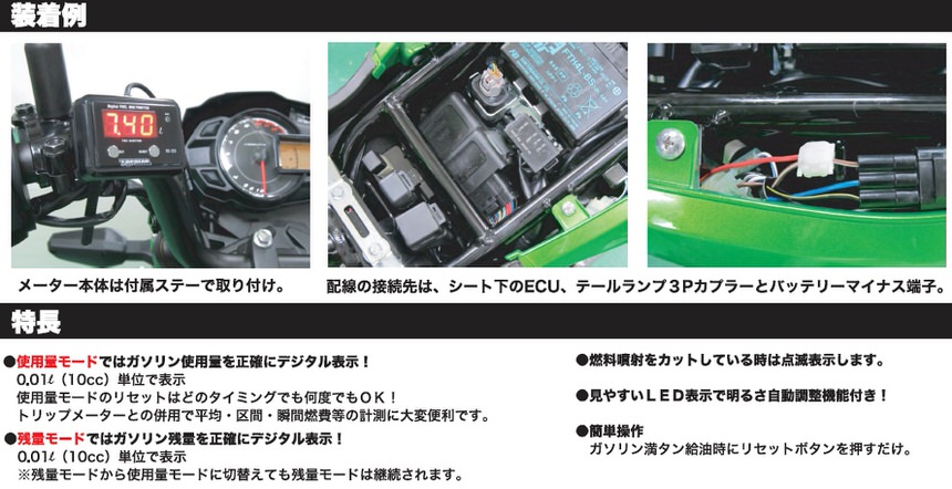 ※残量と使用量の2モード表示燃料系本体はDG-325を使用(DC12V W57×H40×D12.3mm)取付に必要なパーツがすべてそろっております。燃料消費データ登録済みの専用キット