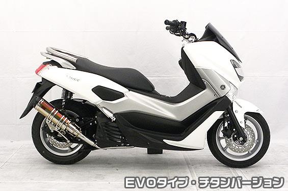 ※平成22年4月1日より施行された認証制度に適合する認証マフラーではありません。ご理解の程よろしくお願い致します。※受注生産商品となりますのでご注文後2週間程度お時間をいただく商品となります。NMAX用 DDRタイプマフラー EVOタイプ チタンバージョンです。※車体型式:EBJ-SE86J/エンジン型式:E3P8E に適合します。新時代から導き出された究極のイノベーションデザインで非常にインパクトあるマフラーです。チタンバージョンは軽量高剛性なチタニウム製パイプにレインボーの焼き色を付けた、非常に高級感の高い仕上がりです。アルミ素材から削り出したビレットタイプのエンドに、ブラックアルマイト処理を施した【 EVOタイプ 】消音用のバッフルが2個装備されている【 ダブルバッフル仕様 】となっており、バッフル無し、バッフル1個装着、バッフル2個装着と3種類の排気音を選べるサウンドセレクトスタイルになっています。バッフルはステンレスタイプ(EVOタイプはプレートタイプ)とアルミタイプの2種類のバッフルが装備されています。音量はバッフル2個装着時の排気音量が 約85db(法定規制値内音量)、バッフル1個装着時の排気音量が 約87db、バッフル非装着時の排気音量が 約89db です。音質も耳障りな音でなく重低音のサウンドになっていますので、ノーマルマフラーではちょっと物足りない方にオススメです。サイレンサーはストレート構造ではなく隔壁構造になっていますので、音量は静かめに抑えられており近所迷惑になる事無く安心して走行できます。低中速を落とすことなく高回転でスムーズに回り扱いやすい設定になっています。振動防止のためサイレンサーとエキパイが2分割となる安心設計になっています。サイレンサーは、2点止めになっていますのでしっかりと固定でき、耐久性にも優れています。無加工ボルトオンにて装着できますので、必要な工具があれば簡単に取り付けできます。(取り付けに必要なボルト類は全て付属しております。)サイレンサーバンドにはスリットタイプを採用してデザインにもこだわっています。サイレンサーの固定にはサイレンサーバンドを採用し、バフ仕上げを施したステンレス製丸棒で組んだステーを介して固定しておりますので、従来のステーの固定より車体と調和した高級感あふれるマフラーです。オールステンレス製で、エキパイからサイレンサーまでバフ仕上げを施しています。ローダウンにも対応しておりますので、安心してご使用下さい。