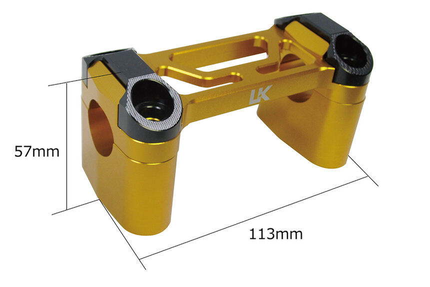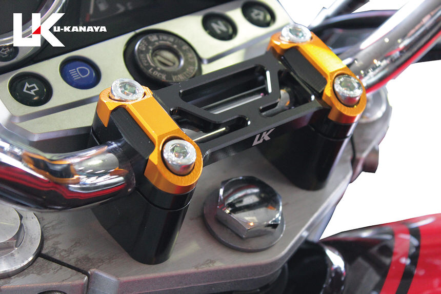 ※ポストトップはブラック・ゴールド・シルバー・ブルー・レッド・チタンカラー・グリーン・オレンジよりご選択いただけます。本体カラー:オレンジU-KANAYAの全商品は日本国内にて専門のスタッフが製品の組み立て及び検品を行っていますので、安心してご使用いただけます。アルミ削り出しハンドルクランプ 1台分のセットです。ポストトップも8色からご選択いただけますので、全64パターンの中からお好きな組み合わせをお選びください。高強度・耐食性に優れた6061アルミ材を使用表面はアルマイト処理されています。精密なフルマシニング加工により高級感のある仕上がりとなっています。純正クランプより15mmアップします。対応ハンドルバー径:φ22.2純正ハンドルポストと入れ替えて装着してください。純正ハンドルの場合はワイヤーやハーネスを変更することなく装着可能です。ステンレス製取付ボルトが4本付属します。この商品は予告なしに価格や仕様を変更する場合があります。