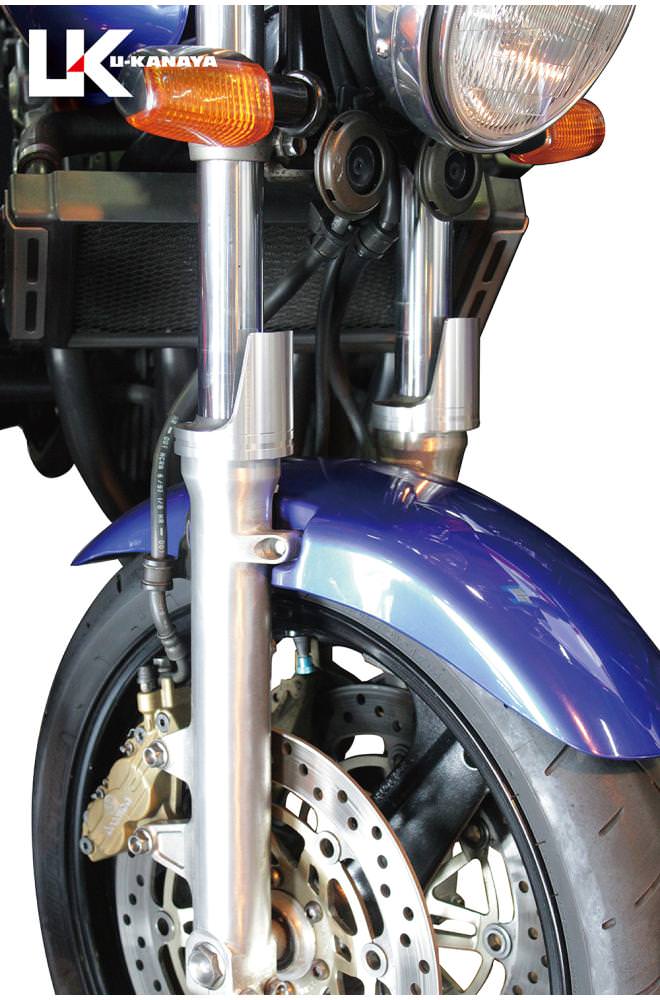※ガードリング部をブラック・ゴールド・シルバー・ブルー・レッド・チタンカラー・グリーン・オレンジよりご選択ください。本体カラー:シルバーU-KANAYAの全商品は日本国内にて専門のスタッフが製品の組み立て及び検品を行っていますので、安心してご使用いただけます。アルミ削り出しフロントフォークガード1台分のセットです。フロントフォークを抜かずに簡単に取り付けができる3ピース構造ガード部8色×ガードリング部8色 合計64パターンの組合せフロントフォークのインナーチューブを飛び石から守りながら、愛車のドレスアップをお楽しみいただけます。高強度・耐食性に優れた6061アルミ材を使用表面はアルマイト処理されています。精密なフルマシニング加工により高級感のある仕上がりとなっています。アウターチューブ適合外径:61.80mm~63.60mm六角レンチ2.0mm(ロングタイプ)×1本とボルト×8本が付属します。ステムカバーが装着されている場合は、ステムカバーを外す必要があります。この商品は予告なしに価格や仕様を変更する場合があります。※ガード部のエッジが鋭いため装着時に怪我をしないようご注意ください。