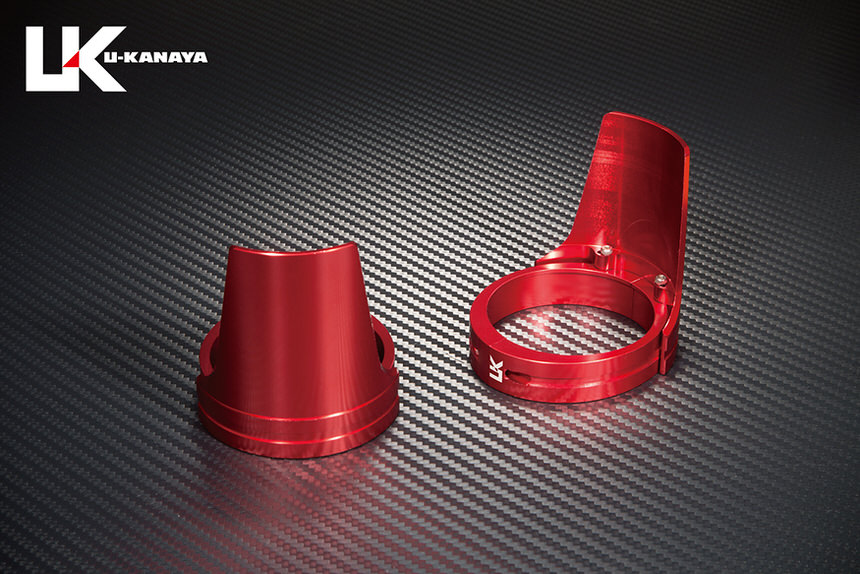 ※ガードリング部をブラック・ゴールド・シルバー・ブルー・レッド・チタンカラー・グリーン・オレンジよりご選択ください。本体カラー:レッドU-KANAYAの全商品は日本国内にて専門のスタッフが製品の組み立て及び検品を行っていますので、安心してご使用いただけます。アルミ削り出しフロントフォークガード1台分のセットです。ガード部8色×ガードリング部8色 合計64パターンの組合せフロントフォークのインナーチューブを飛び石から守りながら、愛車のドレスアップをお楽しみいただけます。高強度・耐食性に優れた6061アルミ材を使用表面はアルマイト処理されています。精密なフルマシニング加工により高級感のある仕上がりとなっています。アウターチューブ適合外径:61.80mm~63.60mm六角レンチ2.0mm(ロングタイプ)×1本とボルト×8本が付属します。ステムカバーが装着されている場合は、ステムカバーを外す必要があります。この商品を装着するには、車体からフロントフォークを取り外すまたは純正フォークガードをカットする必要があります。この商品は予告なしに価格や仕様を変更する場合があります。※ガード部のエッジが鋭いため装着時に怪我をしないようご注意ください。