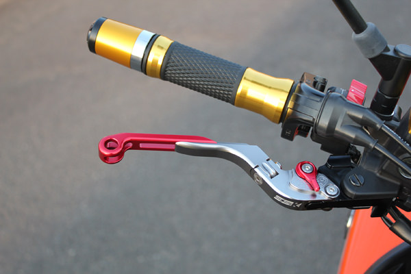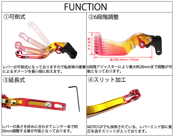 ※エクステンションカラーをブラック・ゴールド・シルバー・ブルー・レッド・チタン・グリーンからお選びください。※レバー本体カラーはゴールドです。※アジャスターカラーはブラックです。※商品画像のカラーは代表的なイメージとなりますので、実際の商品と異なる場合がございます。ご了承くださいませ。高強度アルミニウム合金素材6061を精密加工したレバー本体にアルマイト処理を行うことにより高級感を与え、高精度を実現しました。純正マスターシリンダー、クラッチレバーホルダーに装着できます。握りやすい形状により操作に必要な力を低減。レバーが可倒式になっておりますので転倒等の衝撃によるダメージを最小限に抑えます。6段階アジャスターにより最大約28mmまで調整が可能となっており、好みのレバー位置にセッティング可能ですので手の小さな女性でも快適な操作性を確保出来ます。レバーエンド部は延長式(エクステンション)になっている為、お好みに合わせてレンチ一本で約30mm調整することが可能となっております。レバーエンド部に風圧を逃すスリット加工が施してあります。※アジャスター(調整つまみ)とエクステンション(延長部分)は写真の7色よりお選びいただけます。商品を発送する際に補修部品のリストを同梱させていただいておりますので、破損や日焼け等があった場合の部品単位での販売も可能となっております。※取り付け車種により純正レバーに付属する部品をご使用いただく場合がございます。※レバー交換後は必ず異常が無いか確認を行ってください。【商品仕様】レバー本体カラー:ゴールドアジャスターカラー:ブラック※エクステンションカラーは選択肢からご選択ください。※商品画像は商品イメージ画像になります。カラーの仕様に関しては商品説明をご確認くださいませ。