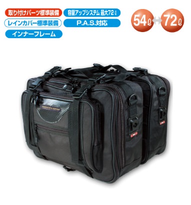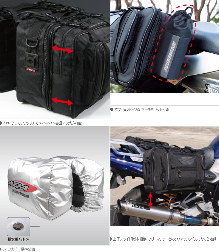 最大72リットルを誇る抜群の収納力でロングツーリングを強力にサポート必要と思われるものは必ず持っていくというツーリストにもってこいの大容量サイドバッグ。容量アップスペースが独立しているので、予定外の荷物の増量にも、メインスペースの荷物をいじることなくスムーズに収納できます。バッグ位置(高さ)調節機構装備でアップマフラーにも対応します。取付パーツ標準装備レインカバー標準装備P.A.S.対応インナーフレーム【付属品】レインカバー×2 RR5632-5ショルダーベルトA×1 RR0013セッティングジョイントパーツA×2 RR0010セッティングゴムベルト×2 RR6095