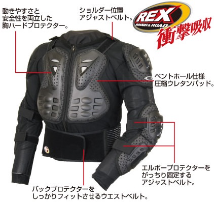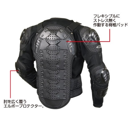 「万が一に備える」上半身を隈なくガードした安心のフルボディプロテクター万遍なく上半身に配された胸・肩・肘・脊椎部のプラスティックプロテクターを、アジャストベルトとストレッチメッシュで優しくボディにフィットさせます。その高いフィット力で万が一の転倒時のズレを最小に抑えしっかりガード。ベースのストレッチメッシュは通気性、速乾性に優れ、スポーツライディングのときや汗ばむ季節でも快適にご使用いただけます。脊椎パッドとウエストベルトは本体から取り外し可能で、シチュエーションに応じた使い分けができます。MATERIAL: 圧縮ウレタンパッド、プラスチックパッド、ストレッチメッシュ