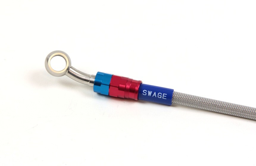 スウェッジラインブレーキホースは、ホースの組付けを、純正品と同じく永久結合"カシメ方式"とすることで、継ぎ目の精度・安全性を飛躍的に向上させています。