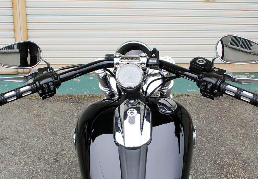 純正比約100mmバック、約70mmアップでゆったりしたポジションの、FXSBブレイクアウト専用ハンドル。ワイヤー変更なしの車検対応ハンドル。仕上げはダブルニッケルクローム。※バンジョーボルトの角度を変更する必要あり。タンクへの干渉を避ける為、スイッチボックスの角度調整が必要。※車検時は取付角度の調整等が必要になります。※サイズ:幅:約790mm 高さ1(グリップ部分水平時):103mm 高さ2(立ち上げ垂直時):約255mm 引き1(グリップ部分水平時):約260mm 引き2(立ち上げ垂直時):約56mm ハンドル径:クランプ部分φ31.8mm、グリップ部分φ25.4mm※材質:スチール※色:クローム