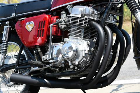CB750Four K0-K6に対応の手曲直管 ブラックです。CB750FOURが現行車だった当時、カスタムの第一歩として流行った集合管を再現。パイプ部は3次元曲げで、集合部は手間のかかるプレス成型された板を溶接するなど、製法にもこだわっています。Z1に対し横に長くエキパイ間が広いCB750FOUR。そのエキパイの集合のさせ方(真ん中への集め方)が絶妙です。ブラックは純正塗装を行う工場内で同様に塗装。サビに非常に強く、400℃×6時間耐熱の超高級耐熱塗料を使用。サイズは、フロントパイプがΦ38、テールパイプはΦ70、スチールフランジ付きで、リヤステーがないタイプとなります。装着後はオイル&オイルフィルターの交換は可能です。センタースタンドは装着不可。インナーサイレンサーはΦ70MSを出荷時に装備。他に装着可能なMRS製サイレンサーはΦ70S(参考音量95dB)、Φ70M(参考音量102dB)、Φ70L(参考音量115dB)です。
