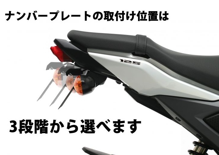好みや、原付2種△マーク(任意)の併用に合わせてナンバープレートの取付け位置を3段階から選べます。メインステーは、LEDウィンカー(別売り)に付け替えた場合でも純正ウィンカー取り外し穴が気にならないデザインです。ナンバー灯:LEDナンバー灯付き別売りのリフレクターキットが必要です。原付二種用△マーク(任意・別売)を装着する際は、ナンバープレート取付け位置を車体から一番遠い位置にしてください。ナンバープレートの角度が40°になるよう設計されています。