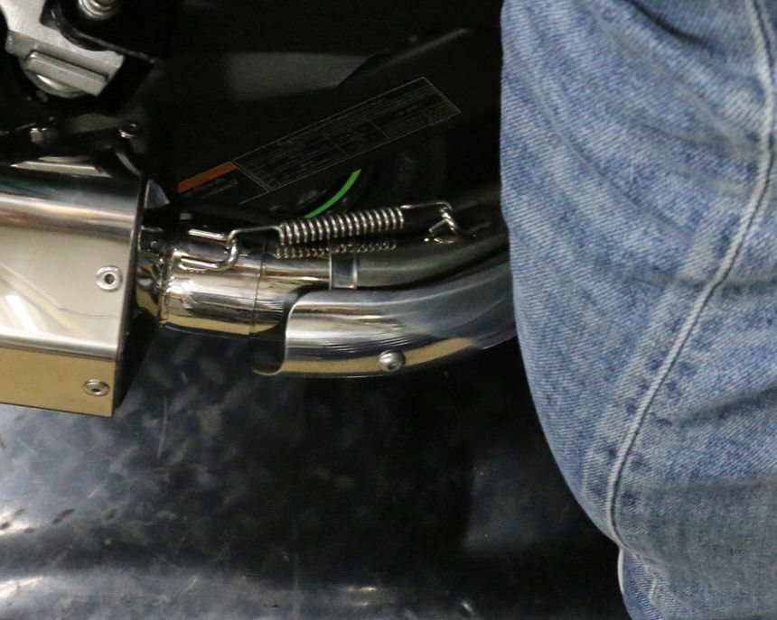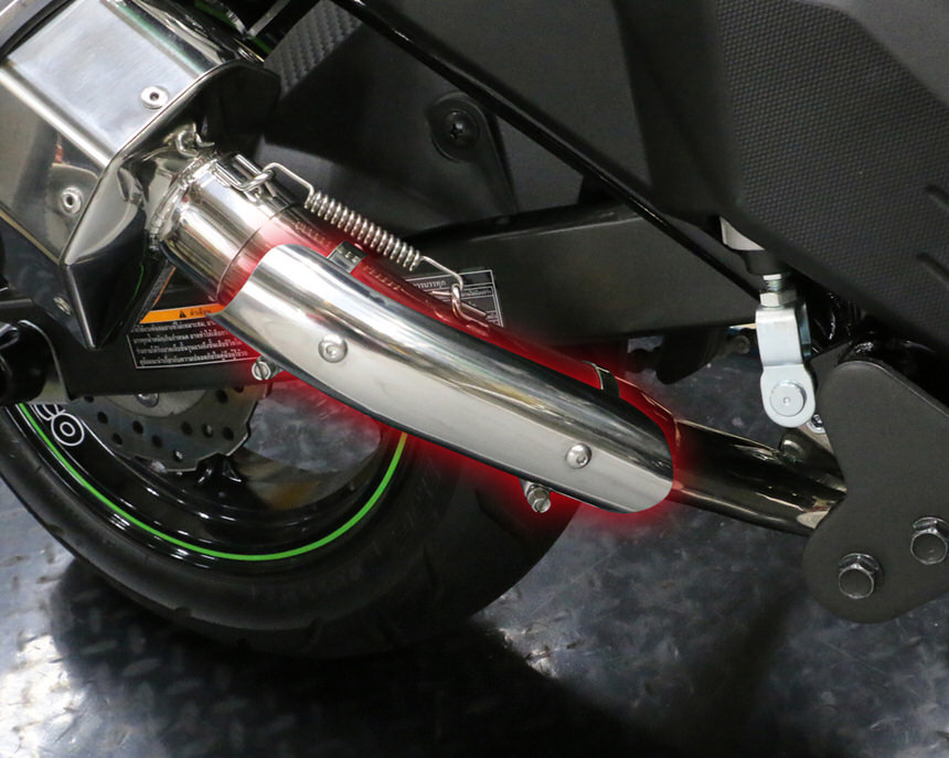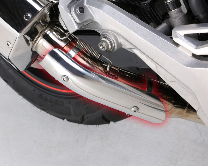 キタコ製エクストリーム-Rマフラー オプションステンレス製暖気後のバイクに跨りながらの移動や取り回し、雨天時のレインパンツや冬季のオーバーパンツを履かれている時等、エキパイの熱による焦げや火傷の防止につながります。