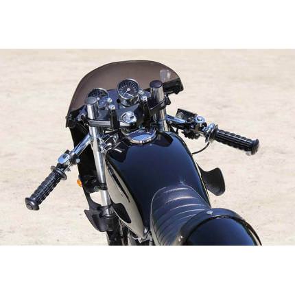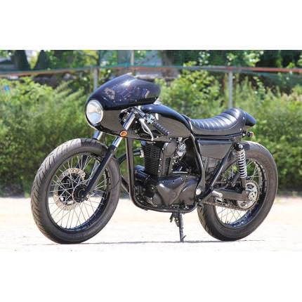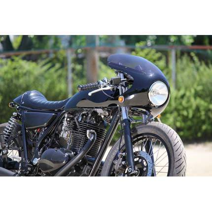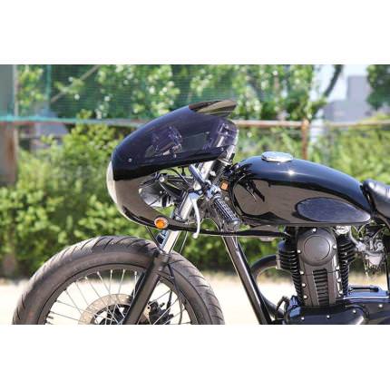 ※要セパレートハンドル(モーターガレージグッズ社製以外干渉未確認)※ハンドルストッパー装着の為、ハンドルロック不可。※純正メーター不可。Φ60メーター及びΦ80メーター必要。先端からスリムコンパクトをコンセプトに設計したハーフカウル。250TR用ボルトオンキット。今までにない細身のカウルでシャープなデザインに最適。サイズ:最大幅:約410mm 高さ:約350mm 下部前後長さ:約525mm ライト取り付け幅:約160mm内容物:カウル、スクリーン×1 スクリーン固定ボルト×6箇所分 ヘッドライト×1 ステー×1式FRP・黒ゲルコートについて・FRPは元々黒色ですが、これは塗装の黒ではなく「キレイな黒色」では御座いません。そのままの使用も可能ですが、経年による変色、薄れが出てきますので塗装される事をお奨め致します。・FRP製品は製造工程上の型抜きの際などに避けることの出来ない擦れ傷が生じます。また、若干の色褪せについても「FRP製品の許容範囲内」とさせて頂きます。あくまでも塗装の下地としてご理解下さい。 ・FRP製品は、無理に力を加えると割れ等の症状がでる場合があります。