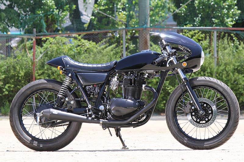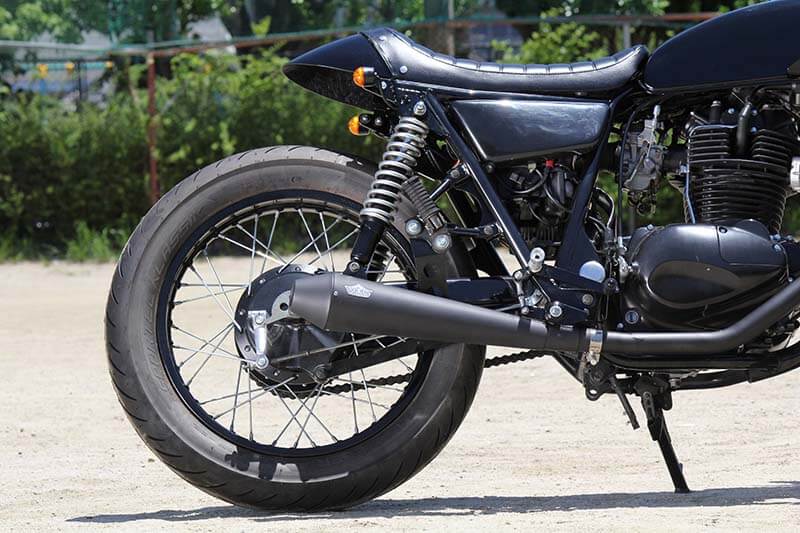 250TRに合わせて専用設計したオールステンレス製スリップオンマフラー。外観はメガホンに味のあるへら絞りのテーパーコーン形状でクラシカルな雰囲気を引き立てます。外観はメガホンに味のあるへら絞りのテーパーコーン形状でクラシカル感を引き立てます。FIモデルにもセッティング無しでそのまま装着頂けるように設計しております。内部構造はストレート構造+成形ウールに試行錯誤を重ねたインナーバッフルで、特に街乗り常用域の中低速をメインに高回転まで全域に渡りパワーアップ(グラフ参照)。インジェクション車は燃調せずともグラフのようなパワーが出ています。歯切れ良く心地よいサウンドにこだわりました。静か過ぎず、大きすぎない音量と、歯切れのよいサウンドにこだわって設計しております音量:FI車でアイドリング時83.2db、4000rpm時98.6dbサイズ:全長:595mm 最大径:100mm内容物:サイレンサー、ステー、バンド、取付ボルトセット×1