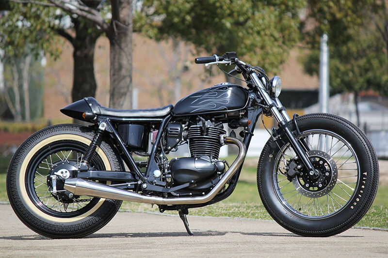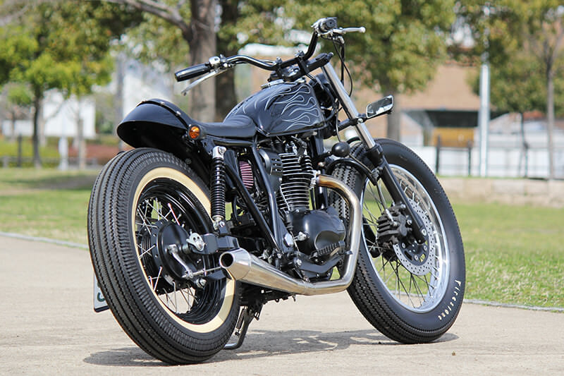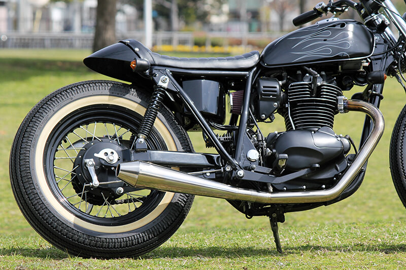 250TRに合わせて専用設計したオールステンレス製スリップオンマフラー。外観はメガホンに味のあるへら絞りのテーパーコーン形状でクラシカルな雰囲気を引き立てます。外観はメガホンに味のあるへら絞りのテーパーコーン形状でクラシカル感を引き立てます。FIモデルにもセッティング無しでそのまま装着頂けるように設計しております。内部構造はストレート構造+成形ウールに試行錯誤を重ねたインナーバッフルで、特に街乗り常用域の中低速をメインに高回転まで全域に渡りパワーアップ(グラフ参照)。インジェクション車は燃調せずともグラフのようなパワーが出ています。歯切れ良く心地よいサウンドにこだわりました。静か過ぎず、大きすぎない音量と、歯切れのよいサウンドにこだわって設計しております音量:FI車でアイドリング時83.2db、4000rpm時98.6dbサイズ:全長:595mm 最大径:100mm内容物:サイレンサー、ステー、バンド、取付ボルトセット×1