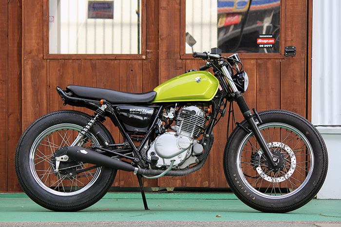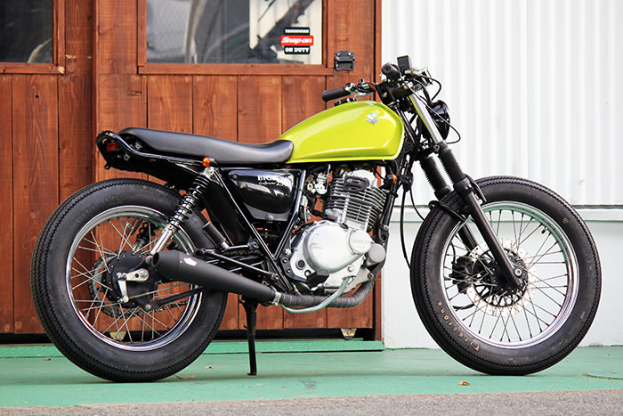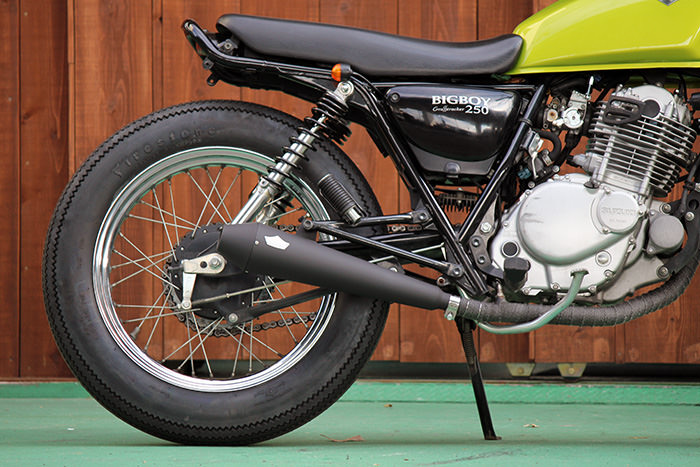 グラストラッカー用TAPERED CORNマフラーはFI車のみ対応となります。※キャブ車は差込径が異なります。グラストラッカーに合わせて専用設計したオールステンレス製スリップオンマフラー。外観はメガホンに味のあるへら絞りのテーパーコーン形状でクラシカルな雰囲気を引き立てます。クラシカルな印象を与えるエンドデザイン外観はメガホンに味のあるへら絞りのテーパーコーン形状でクラシカル感を引き立てます。FIモデルにもそのまま装着可能FIモデルにセッティング無しでそのまま装着頂けるように設計しております。中低速を大幅に、高回転まで全域に渡りパワーアップ。内部構造はストレート構造+成形ウールに試行錯誤を重ねたインナーバッフルで、特に街乗り常用域の中低速をメインに高回転まで全域に渡りパワーアップ(グラフ参照)。インジェクション車は燃調せずともグラフのようなパワーが出ています。サイズ:全長:480mm 最大径:100mm内容物:サイレンサー、バンド×1