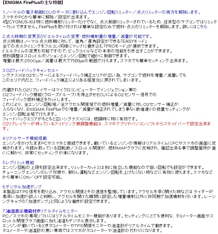 Bluetooth /Bluetooth LE接続モデル アンドロイド/iOS両方に対応しますアンドロイド端末、iOS端末とWindowsPCに接続可能です。MACには接続不可同じ燃調MAPをENIGMA FirePlusを介してPCとスマホで共用出来ます。シグナスX(2型3型)専用SE44J、台湾5期、台湾7期2015年11月発売以降の4型モデルには専用品(FBD-211)があります。当製品はインジェクション制御バイクのノーマルECUに割り込み接続することにより、 優れた点火時期制御および燃料制御性能を発揮します。今まで出来なかったさまざまな点火/燃料セッティングや変更が出来るようになります。全てのコントロールはパソコン画面かスマートフォン(iOS端末またはアンドロイドスマホ)で行えます。専用のENIGMA FirePlus操作用ソフトウェアー/説明書はディルツジャパン社HPより無料でPCにダウンロード出来ます。スマートフォン用アプリiOS版はApp Storeから、アンドロイド版はGoogle Playよりダウンロード(300円税抜)して下さい。(各説明画面をよく読んでお間違えの無いようお願い致します)