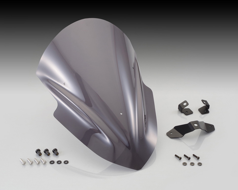 段付きエアロスタイルのドレスアップスクリーンです。スクリーン:ポリカーボネイト(スモーク)ステー:スチール製ブラックスクリーン寸法:高さ460mm 幅325mm取付ボルト、ウェルナット類付属ノーマル比でスクリーンは75mm高くなります。