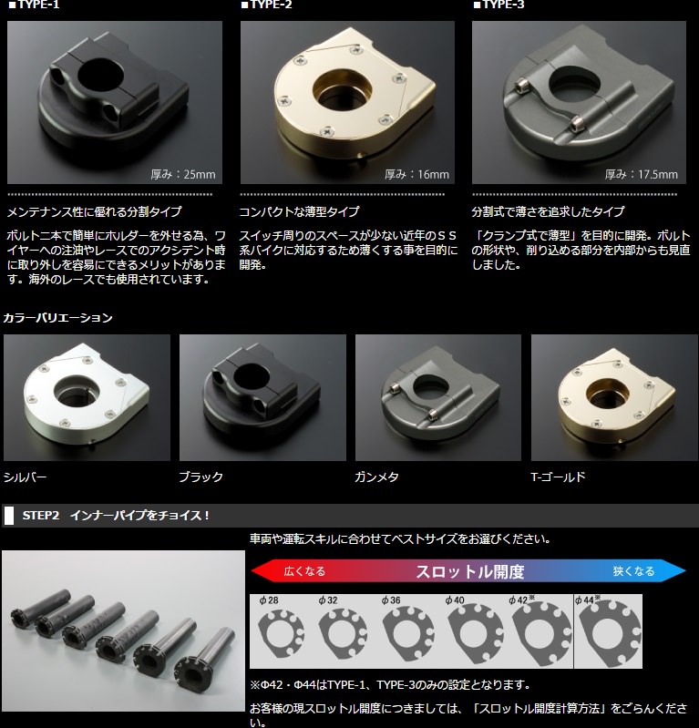 分割式で薄さを追求したタイプ「クランプ式で薄型」を目的に開発。ボルトの形状や、削り込める部分を内部からも見直しました。厚み17.5mmインナーパイプ(TYPE-2は4サイズ)を交換することで、乗りやすさの要となるアクセル操作のセッティングを可能にします。巻取径を大きくして、少ない手首の返しで瞬時にワイドオープンさせる仕様もよし、 逆に小さくして、より繊細なコントロール性能を得るのもよし。あなたのバイクスタイルに合ったスロットルを手に入れてください。取り付け方法:クランプ式重さ:68g(ストッパーボルト6g含む)【商品仕様】タイプ3 ホルダーカラーシルバーインナー巻取径Φ40ワイヤー金具メッキ ブラックアウター