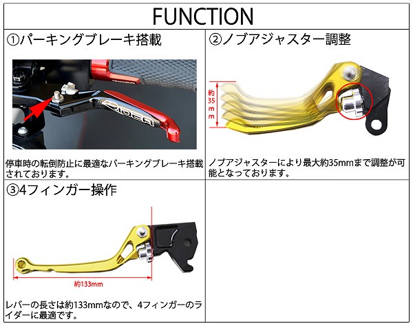※取り付け車種により純正レバーに付属する部品をご使用いただく場合がございます。※レバー交換後は必ず異常が無いか確認を行ってください。※画像はイメージです。実際の商品仕様、カラーと異なる場合がございます。本製品のカラー:レッド純正のブレーキマスターシリンダーに装着できます。高強度アルミニウム合金素材6061を精密加工したレバー本体にアルマイト処理を行うことにより高級感を与え、高精度を実現しました。停車時の転倒防止に最適なパーキングブレーキ搭載。ノブアジャスターにより最大約35mmまで調整が可能となっており、好みのレバー位置にセッティング可能です。メーカー品番:LV3-A08-RDレバー長さ:(約)133mm(FUNCTIONの画像をご参照ください※取り付けた際の角度によって長さに若干の誤差が生じます)