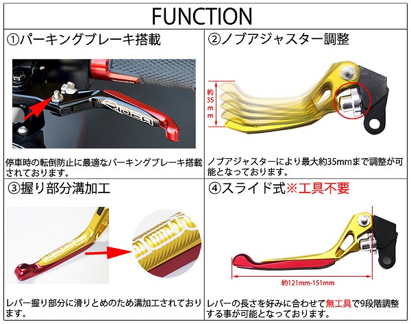 ※取り付け車種により純正レバーに付属する部品をご使用いただく場合がございます。※レバー交換後は必ず異常が無いか確認を行ってください。※画像はイメージです。実際の商品仕様、カラーと異なる場合がございます。レバー本体:ブラック純正のブレーキマスターシリンダーに装着できます。高強度アルミニウム合金素材6061を精密加工したレバー本体にアルマイト処理を行うことにより高級感を与え、高精度を実現しました。停車時の転倒防止に最適なパーキングブレーキ搭載レバー前面部分には滑り止めの溝加工を施し、操作の安全性を高めます。ノブアジャスターにより最大約35mmまで調整が可能となっており、好みのレバー位置にセッティング可能です。レバーエンド部は延長式になっている為、最大約30mmの9段階調整が可能です。※工具不要メーカー品番:LV3-EE-A08-BKレバー長さ:(約)121-151mm(FUNCTIONの画像をご参照ください※取り付けた際の角度によって長さに若干の誤差が生じます)