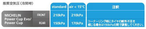 レースからサーキット走行までよりアグレッシブにライディングを楽しむMICHELIN PowerSlick をベースに開発された公道走行可能なサーキット用タイヤ【製品技術】1.MICHELINAdaptiveCasingTechnology(ミシュラン・アダプティブ・ケーシング・テクノロジー)直線からコーナーリングに至るまで様々な角度に対応したケーシング構造を採用。ショルダー部にかけて徐々に剛性が増すように最適化された内部構造は特にコーナーリングの安定性に効果を発揮します。2.2CT:Dual-CompoundTechnology(デュアル・コンパウンド・テクノロジー)センター部分には耐久性の高いラバー・コンパウンドを、ショルダー部にはグリップ力の高いコンパウンドを配置することでロングライフと安全性を両立しました。3.SCT:SyntheticComponentTechnology(シンセティック・コンポーネント・テクノロジー)合成ゴム化合物MRSE(ミシュラン・レーシング・合成エラストマー)とHTSC樹脂(ハイテク合成化合物)の採用により、グリップ力を発揮する温度域までできるだけ早く温まるように設計されています。サーキット走行などで、走り始めてすぐにグリップ力を発揮し、最大リーン角まで倒し込むことができるタイヤを目指しました。4.NST:NearSlickTechnology(ニア・スリック・テクノロジー)トレッド部におけるグルーブの比率を5%以下とし、スリックタイヤにとても近いタイヤです。グルーブを減らし、特に中央部とショルダー部では完全になくすことで、幅広い接地面を確保しています。40-60度の深いリーン角でも高いグリップ力を発揮します。【MICHELIN POWER CUP EVO使用上の注意】1, 低温下(気温5℃以下)において衝撃を与えたり、変形させることにより、タイヤにひび割れが生じる恐れがあります。2, タイヤの装脱着前は、気温10℃以上の場所で少なくとも24時間保管するようにしてください。3, トレッド面にひび割れを発見した場合は、直ちに使用をお控えください。