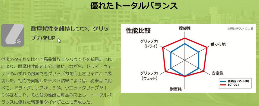 「MOBICITY」の名前が示す通り、街乗りで真価を発揮する次世代モデル。125cc〜250ccのミドルからビッグスクーターに特化したタイヤで、高品質コンパウンドと新たなパターンを採用することで、従来とは次元の違う操作性・安定性・乗り心地を実現!125cc-250cc(600cc)を中心に、車両の発売当初から数多くの完成車メーカーに純正採用され、また長年このクラスにおける補修用タイヤの開発・販売を続けてきたIRC TIRE。今回、「バランスに優れたタイヤ」をテーマに次世代モデルを開発。従来のタイヤを1から見直し、より排水性に考慮した新デザインのパターンを採用し、同時にコンパウンドも高品質なものへと刷新。これにより、従来品が持つ耐摩耗性を維持しつつ、グリップ力をアップさせることに成功。操作性・安全性・乗り心地の向上も実現させた。街乗りからツーリング、通勤、通学にいたるまで、125cc-250cc(600cc)に乗るすべてのユーザーに、IRCが自信を持ってお届けする次世代タイヤ「MOBICITY SCT-001」を体感して欲しい。耐摩耗性を維持しつつ、グリップ力をUP従来のタイヤに比べて高品質なコンパウンドを採用。これにより、耐摩耗性能を十分に維持しながら、ドライ・ウェットのいずれの路面でもグリップ力を向上させることに成功した。社内で実施したテスト結果によれば、従来品に比べて、ドライグリップが15%、ウエットグリップが10%ほどUP。その他の性能も軒並み向上し、トータルバランスに優れた新定番タイヤがここに完成した。ドライ・ウェット路面のブレーキ性能が向上テストコースにおいてブレーキテストを実施した結果、従来品に比べてドライ路面の場合で8%、ウェット路面の場合で10%ほど制動性能がアップした。路面状況に関わらず、事故などのトラブルや雨の日のスリップなどが発生する危険性を低減させ、「早く停止できる」という安心感を味わえるタイヤに。安定性・操作性・乗り心地に好評価タイヤの設計をゼロからすべて見直したうえで、排水性に富んだ全く新しいデザインのパターンを採用。従来品と比べて操縦性、乗り心地、安定性の評価が大幅にアップ(当社テストライダー比較)し、今までとの確かな違いを感じさせる、爽快な乗り心地を体感できるようになった。