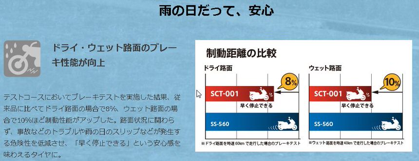 「MOBICITY」の名前が示す通り、街乗りで真価を発揮する次世代モデル。125cc〜250ccのミドルからビッグスクーターに特化したタイヤで、高品質コンパウンドと新たなパターンを採用することで、従来とは次元の違う操作性・安定性・乗り心地を実現!125cc-250cc(600cc)を中心に、車両の発売当初から数多くの完成車メーカーに純正採用され、また長年このクラスにおける補修用タイヤの開発・販売を続けてきたIRC TIRE。今回、「バランスに優れたタイヤ」をテーマに次世代モデルを開発。従来のタイヤを1から見直し、より排水性に考慮した新デザインのパターンを採用し、同時にコンパウンドも高品質なものへと刷新。これにより、従来品が持つ耐摩耗性を維持しつつ、グリップ力をアップさせることに成功。操作性・安全性・乗り心地の向上も実現させた。街乗りからツーリング、通勤、通学にいたるまで、125cc-250cc(600cc)に乗るすべてのユーザーに、IRCが自信を持ってお届けする次世代タイヤ「MOBICITY SCT-001」を体感して欲しい。耐摩耗性を維持しつつ、グリップ力をUP従来のタイヤに比べて高品質なコンパウンドを採用。これにより、耐摩耗性能を十分に維持しながら、ドライ・ウェットのいずれの路面でもグリップ力を向上させることに成功した。社内で実施したテスト結果によれば、従来品に比べて、ドライグリップが15%、ウエットグリップが10%ほどUP。その他の性能も軒並み向上し、トータルバランスに優れた新定番タイヤがここに完成した。ドライ・ウェット路面のブレーキ性能が向上テストコースにおいてブレーキテストを実施した結果、従来品に比べてドライ路面の場合で8%、ウェット路面の場合で10%ほど制動性能がアップした。路面状況に関わらず、事故などのトラブルや雨の日のスリップなどが発生する危険性を低減させ、「早く停止できる」という安心感を味わえるタイヤに。安定性・操作性・乗り心地に好評価タイヤの設計をゼロからすべて見直したうえで、排水性に富んだ全く新しいデザインのパターンを採用。従来品と比べて操縦性、乗り心地、安定性の評価が大幅にアップ(当社テストライダー比較)し、今までとの確かな違いを感じさせる、爽快な乗り心地を体感できるようになった。