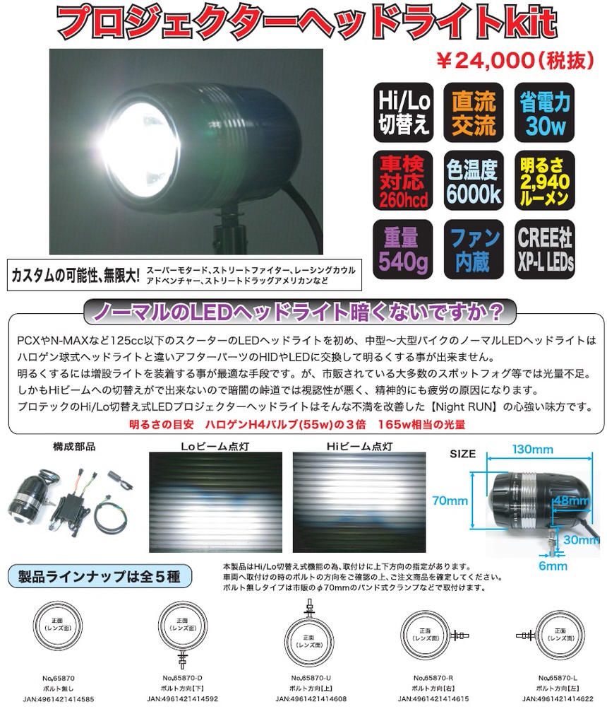 車検対応AC/DC12V共用 30W 6000K仕様:ボルト方向【下】PCXやNMAXなど125cc以下のスクーターのLEDヘッドライトをはじめ、中型〜大型バイクのノーマルLEDヘッドライトはハロゲン球式ヘッドライトと違いアフターパーツのHIDやLEDに交換して明るくする事が出来ません。明るくするには増設ライトを装着する事が最適な手段です。が、市販されている大多数のスポットフォグ等では光量不足。しかもHiビームへの切替えがで出来ないので暗闇の峠道では視認性が悪く、精神的にも疲労の原因になります。プロテックのHi/Lo切替え式LEDプロジェクターヘッドライトはそんな不満を改善した【Night RUN】の心強い味方です。