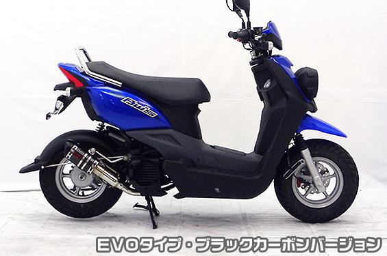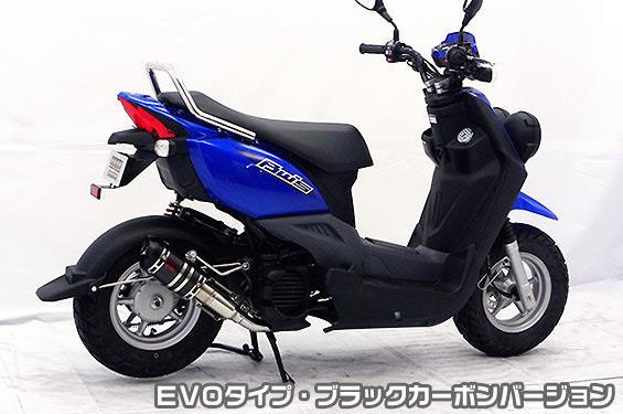 ※受注生産商品となっており、商品手配後 2週間程度入荷にお時間を頂きます。BW'S50【JBH-SA53J】用 ZZRタイプマフラー EVOタイプ ブラックカーボンバージョンです。※車体型式:JBH-SA53J のO2センサー装着モデルに適合します。※その他の型式、O2センサー非装着モデルには適合しませんのでご注意下さい。※平成22年4月1日より施行された認証制度に適合する認証マフラーではありません。ご理解の程よろしくお願い致します。新時代から導き出された究極のイノベーションデザインで非常にインパクトあるマフラーです。ブラックカーボンバージョンは、ステンレスサイレンサーにカーボンシートを巻いた仕様で、耐久性が抜群に高い構造を採用しています。アルミ素材から削り出したビレットタイプのエンドに、ブラックアルマイト処理を施した【EVOタイプ】消音用のバッフルが2個装備されている【ダブルバッフル仕様】となっており、バッフル無し、バッフル1個装着、バッフル2個装着と3種類の排気音を選べるサウンドセレクトスタイルになっています。バッフルはステンレスタイプ(EVOタイプはプレートタイプ)とアルミタイプの2種類のバッフルが装備されています。音量はバッフル2個装着時の排気音量が 約82db(法定規制値内音量)、バッフル1個装着時の排気音量が 約84db、バッフル非装着時の排気音量が 約87db です。 音質も耳障りな音でなく重低音のサウンドになっていますので、ノーマルマフラーではちょっと物足りない方にオススメです。サイレンサーはストレート構造ではなく隔壁構造になっていますので、音量は静かめに抑えられており近所迷惑になる事無く安心して走行できます。低中速を落とすことなく高回転でスムーズに回り扱いやすい設定になっています。振動防止のためサイレンサーとエキパイが2分割となる安心設計になっています。サイレンサーは、2点止めになっていますのでしっかりと固定でき、耐久性にも優れています。無加工ボルトオンにて装着できますので、必要な工具があれば簡単に取り付けできます。(取り付けに必要なボルト類は全て付属しております。)サイレンサーバンドにはスリットタイプを採用してデザインにもこだわっています。サイレンサーの固定にはサイレンサーバンドを採用し、バフ仕上げを施したステンレス製丸棒で組んだステーを介して固定しておりますので、従来のステーの固定より車体と調和した高級感あふれるマフラーです。オールステンレス製で、エキパイからサイレンサーまでバフ仕上げを施しています。ローダウンにも対応しておりますので、安心してご使用下さい。