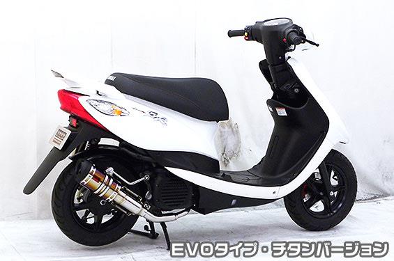 ※受注生産商品となっており、商品手配後 2週間程度入荷にお時間を頂きます。※平成22年4月1日より施行された認証制度に適合する認証マフラーではありません。ご理解の程よろしくお願い致します。※ジョグ【型式:JBH-SA55J】・ジョグZR【型式:JBH-SA56J】のO2センサー装着モデルに適合します。※その他の型式、O2センサー非装着モデルには適合しませんのでご注意下さい。新時代から導き出された究極のイノベーションデザインで非常にインパクトあるマフラーです。チタンバージョンは軽量高剛性なチタニウム製パイプにレインボーの焼き色を付けた、非常に高級感の高い仕上がりです。アルミ素材から削り出したビレットタイプのエンドに、ブラックアルマイト処理を施した【EVOタイプ】消音用のバッフルが2個装備されている【ダブルバッフル仕様】となっており、バッフル無し、バッフル1個装着、バッフル2個装着と3種類の排気音を選べるサウンドセレクトスタイルになっています。バッフルはステンレスタイプ(EVOタイプはプレートタイプ)とアルミタイプの2種類のバッフルが装備されています。音量はバッフル2個装着時の排気音量が 約82db(法定規制値内音量)、バッフル1個装着時の排気音量が 約84db、バッフル非装着時の排気音量が 約87db です。 音質も耳障りな音でなく重低音のサウンドになっていますので、ノーマルマフラーではちょっと物足りない方にオススメです。サイレンサーはストレート構造ではなく隔壁構造になっていますので、音量は静かめに抑えられており近所迷惑になる事無く安心して走行できます。低中速を落とすことなく高回転でスムーズに回り扱いやすい設定になっています。振動防止のためサイレンサーとエキパイが2分割となる安心設計になっています。サイレンサーは、2点止めになっていますのでしっかりと固定でき、耐久性にも優れています。無加工ボルトオンにて装着できますので、必要な工具があれば簡単に取り付けできます。(取り付けに必要なボルト類は全て付属しております。)サイレンサーバンドにはスリットタイプを採用してデザインにもこだわっています。サイレンサーの固定にはサイレンサーバンドを採用し、バフ仕上げを施したステンレス製丸棒で組んだステーを介して固定しておりますので、従来のステーの固定より車体と調和した高級感あふれるマフラーです。オールステンレス製で、エキパイからサイレンサーまでバフ仕上げを施しています。ローダウンにも対応しておりますので、安心してご使用下さい。