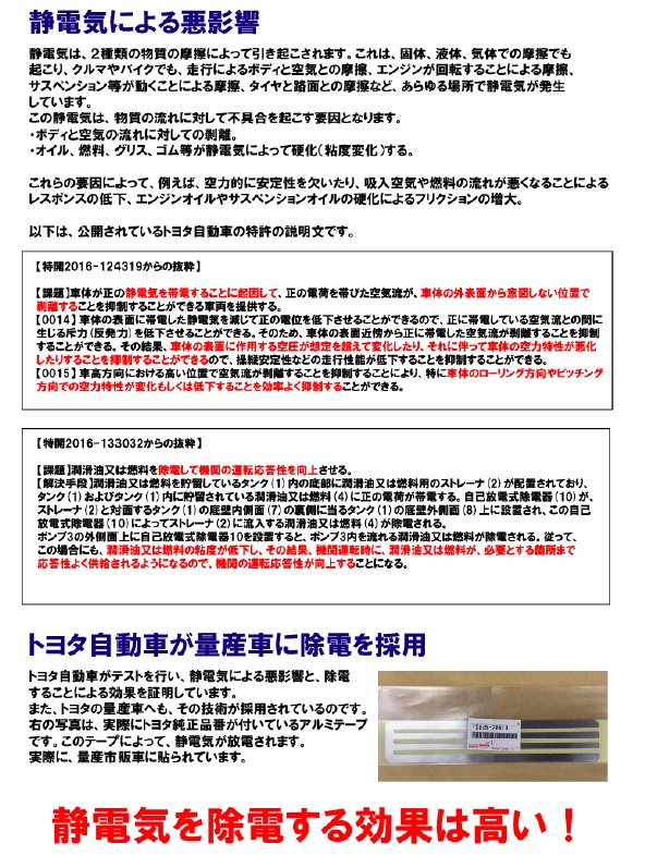 自動車や二輪車は、走行中に各部でかなりの静電気が蓄積されています。その静電気による悪影響は思っているよりも大きく、エンジン性能やサスペンション性能、そして空力効果までも悪化させてしまいます。これらの静電気を放電させ、除電することによって、本来の性能を甦えらせるボルト、 ナットです。車両のボルトと交換、またはボルトの突き出し部にナットを追加で装着するだけの簡単取り付けで、効果を体感することができます。【静電気による悪影響】ボディと空気の摩擦、タイヤと路面の摩擦、エンジン自体が動くことによる吸入空気、オイル、冷却水の摩擦、サスペンションが動く摩擦、そのすべてに静電気が起きます。静電気は、空気の剥離を起こしたり、オイルやグリス、燃料の硬化を引き起こします。 それにより、エンジンレスポンスの低下や、燃費の低下、サスペンションの動きの妨げなどの悪影響が引き起こされます。これらの内容はトヨタ自動車による特許申請により実証されています。【取り付けの際の注意事項】・王冠部分は鋭利になっていますので、怪我の無いよう取扱に注意してください。・スペース的な問題で、除電ボルト、除電ナットが取り付けできない場合もあります。 事前に取り付け場所のスペースをご確認ください。・除電ボルトはキャップボルトの上に除電ナットが溶接されています。取り付け時には、ナットではなくボルトを六角レンチ等で締めてください。・除電効果は、車両の部位により大きく異なる場合もあります。※画像には他のサイズが含まれています。※装着画像はイメージです。※こちらは単品での販売となります。