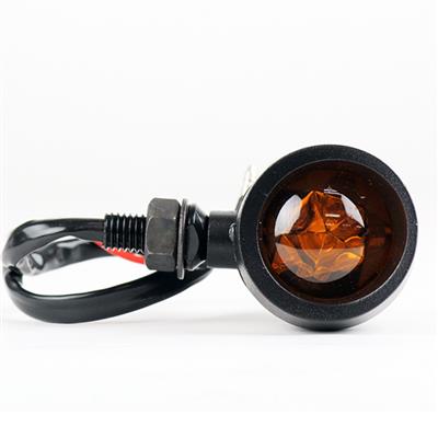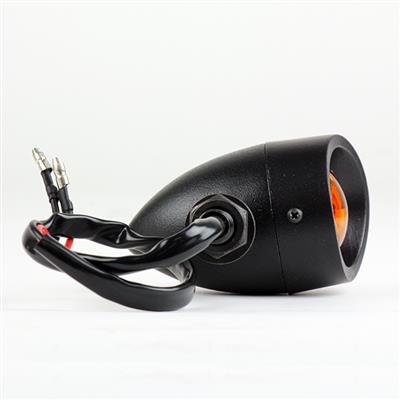 ライトリムがブリムタイプ(つば付き)のLEDウインカー。ボディはアルミキャスト、表面処理は鋳造の質感を残した鈍い輝きのブラック塗装。ブリムの方向は調整可能。配線色赤:プラス 黒:マイナス材質本体:アルミ レンズ:樹脂内容物本体×2サイズ外径:φ44mm 長さ:71mm 取付からレンズ中心:33.6mm 取付ボルトサイズ:M10-1.5※車種によってはリレーの交換、抵抗を付けるなどが必要。