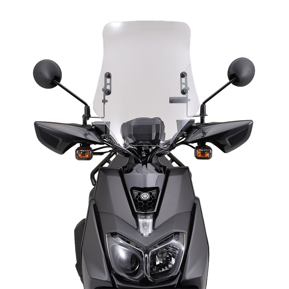 スポーティーなエアロ形状フォルムのウインドシールドセット。スクリーンエンドの小さく跳ね上がったスポイラーが正面から来た空気を上部へ送り、体への抵抗を軽減します。ウインドシールドの素材は、ポリカーボネート(厚さ3mmクリアー)を採用。同厚のアクリルに対し約30倍の強度を持ち、高い透明度と耐久性を両立。またコーティングを施し耐傷性,耐UV性をアップ。ウインドシールドの角度調整(約10度)が可能な車種専用の取付ステー付き。スマートフォンやメーター等が装着可能なオプションバーφ22.2×58L付属。角度調整可能:ウインドシールドの角度調整が可能な車体側取付ステーを採用。状況に合わせ約10度の範囲内でウインドシールドの角度調整が可能。クランプバー付属:付属のクランプバーを装着すれば、市販のφ22.2パイプ用クランプが使用可能。(一部、付属していない品番もございます。)スマートフォンなどのデジモノ装着に最適です。風の流れかた:スクリーンエンドの小さく跳ね上がったスポイラーが正面から来た空気を上部へ送ります。・スクリーン色:クリアー・厚さ:3mm・材質:ポリカーボネート※ガソリン、ブレーキ液、アセトン、シンナー等の化学物質がウインドシールドに付着しないようにしてください。付着しますと、細かいヒビや傷、曇り、変形、ワレ等が生じます。付着してしまった場合はただちに水で洗浄してください。※ウインドシールド清掃の際には、洗車ブラシ等の使用や乾いた布での乾ぶきはしないでください。また、コンパウンド等の研磨剤入りの磨き剤は使用しないでください。※ウインドシールド装着時は風等の影響を受けやすく、不安定な場所に駐停車すると転倒の恐れがありますので土の上等、路面のやわらかい場所や傾斜した場所には駐停車しないでください。必ずアスファルト等の固く安定した平坦地に駐停車してください。※ウインドシールドは、太陽光を直接あてると、小さな領域に集光する光学的特性があります。そのため車体の他の部分に損傷を与える場合がありますので、直射日光があたったままの状態で駐停車しないようにしてください。