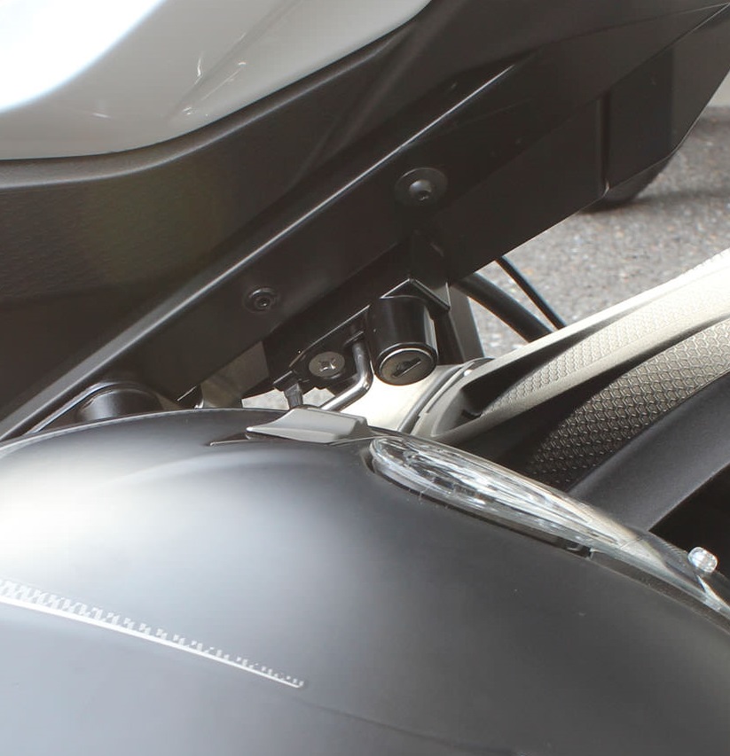 S1000RRベースの4気筒エンジンを使ったアドベンチャースポーツバイクに便利なヘルメットロックが登場。使いやすさを考え、左側タンデムステップに装着。スチール製ブラック仕上げ