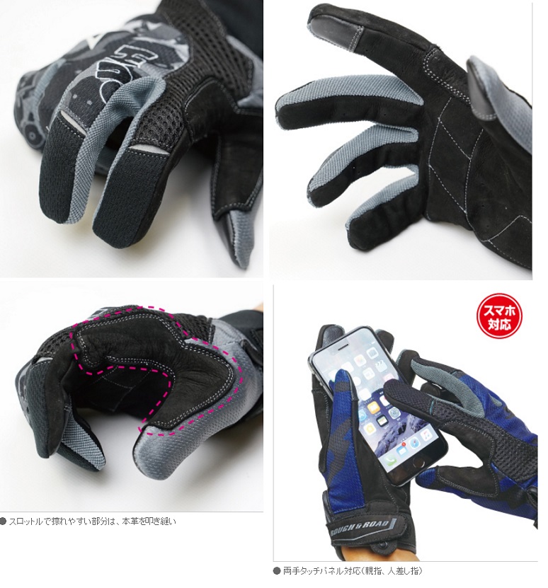 夏を快適に乗り切るメッシュグローブの切り札暑さのあまりグローブをはめるのをためらうような真夏は、ついつい素手で乗りたくなりますが、万一を考えると危険な選択です。この商品はそんな時期におすすめの吸汗速乾素材をメイン素材に採用したサマーライトグローブです。 ベンチレーション効果と優れた放熱効果、抜群のフィット感、軽い操作性で酷暑の夏も快適にライディングできます。ベーシックな三色に加え、プリント柄三色をプラスした6カラーのサマーメッシュグローブです。 ※フィット感を重視してタイトな仕上がりになっております。MATERIAL: 甲側/速乾メッシュ、ラッセルメッシュ、クロロプレン、ニットジャージ 掌側/牛革、スマートタッチレザー・FUNCTION:両手タッチパネル対応 ※使用状況により作動しにくい場合もありますスマホ対応