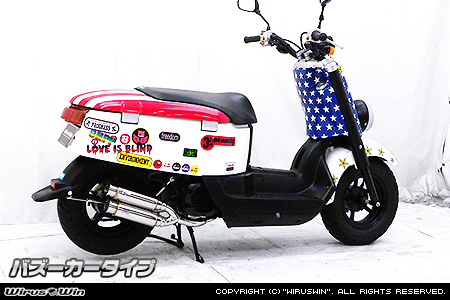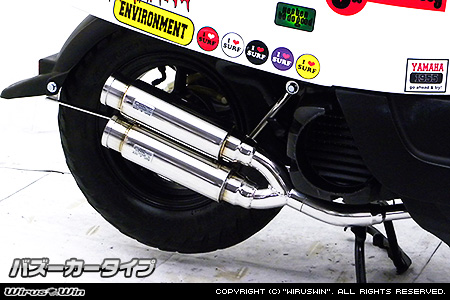 ※平成22年4月1日より施行された認証制度に適合する認証マフラーではありません。 ご理解の程よろしくお願い致します。2本出しタイプマフラーは発売以来大好評で、いまだ人気が衰えず絶好調です。アトミックツインマフラーは、ビックスクーター界で主流になりはじめたサイレンサーを短くした、最先端のトレンドマフラーです。極端に派手すぎずできるだけシンプルに自然なラインをイメージして制作しました。サイレンサーをできるだけ短くとり、車体のラインに調和させました。たくさんのお客様からの意見を取り入れて、あらゆるカスタムに似合うよう高級感が高く、かつシンプルなイメージでデザイン、製作いたしました。他社には無い時代を先行く2本出しマフラーが完成しました。サイレンサー出口は、バズーカータイプ。音質はとてもマイルドで重低音です。車体への固定方法は、画像では分かりにくいですがノーマルマフラーと同じ2点止めです。フェンダー固定用ステーも付いていますのでしっかり固定できます。センタースタンドはそのままで取り付けでき使用も可能です。WirusWinステッカー、WirusWInプレート付属。材質は、耐久性、耐腐食性の高いオールステンレス製です。 バッフル(消音用のパーツ)をサイレンサー1本に対し1つずつ標準装備!!簡単な作業で3種類の音量が選択可能!!バッフル両方装着時 排気音量 約 84db(法定音量規制内)バッフル片側装着時 排気音量 約 86dbバッフル非装着時 排気音量 約 88db