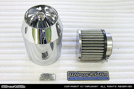 還元パイプに対応しております。従来のエアークリーナーKitより、さらに低価格で手軽にパワーフィルター化できる今までに無いKitです。ボディはプラスチック製でクロムメッキを施しております。インテーク部分はステンレス製バフ仕上げで、取付ステーには強度の強い12mm径のステンレス丸棒を採用し、幾度ものテストを重ね完成させていますので、強度、耐久性はバッチリです。ノーマルエアークリーナーから、簡単にボルトオンで付け替えできます。ローダウン車両にも対応いたします。クリーナーにはパワーフィルターが装備されています。従来はパワーフィルターにあわせて、インジェクションコントローラーなどでのセッティングを行わなくてはいけませんでしたが、この商品は必要吸気量にあわせて一定の範囲内で無段階に調整でき、還元パイプ対応ということもあり簡単にセッティング出しやすく、パワーアップが計れます。画像(A)、(B)は、ブリーズタイプ エアクリーナーKitの内部で、(A)はエアーの量を最小限した状態。(B)はエアーの量を最大限にした状態です。ノーマルマフラー、ウイルズウィン製マフラーを付けた場合のエアーの量は、最小限から、15mm〜25mmのばした範囲で、ベストセッティングが捜し出せます。※ボアアップ、駆動系、抜けの良いマフラーに変更などの改造をされている場合は、インジェクションコントローラーなどでのセッティングが必要となることがあります。また、さらなるパワーアップを望む方にもインジェクションコントローラーなどでのセッティングは必要です。デザインカスタム重視の方、手軽にパワーフィルター化したい方などに特にお勧めです。WirusWinステッカー、WirusWinプレート付属。