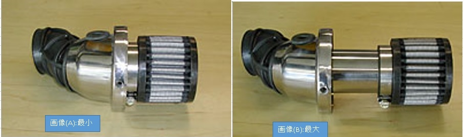 画像(A)、(B)は、ブリーズタイプ エアクリーナーKitの内部で、(A)はエアーの量を最小限した状態。(B)はエアーの量を最大限にした状態です。ノーマルマフラー、ウイルズウィン製マフラーを付けた場合のエアーの量は、最小限から、15mm〜25mmのばした範囲で、ベストセッティングが捜し出せます。