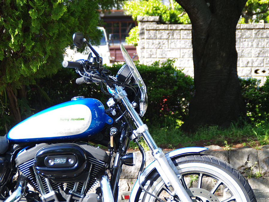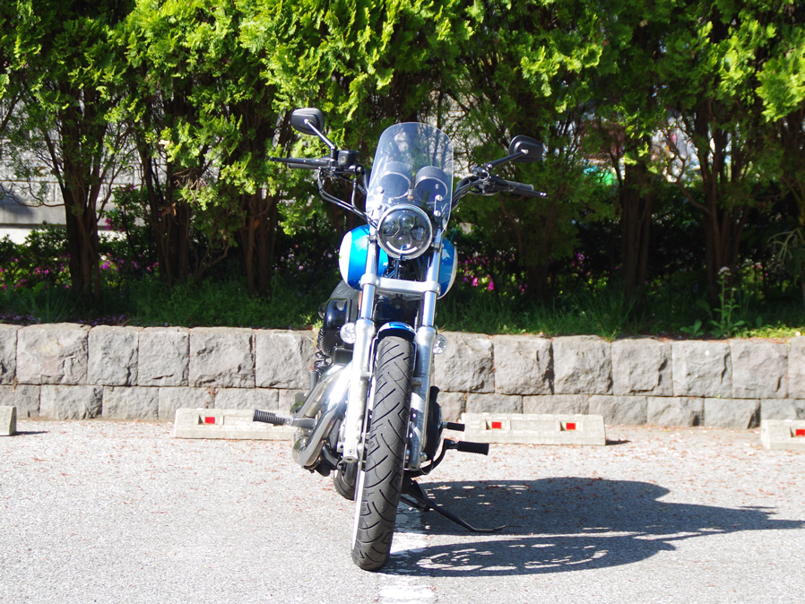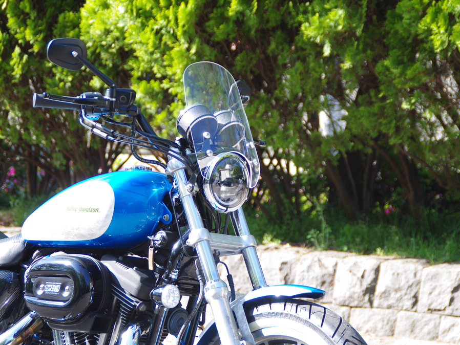 スクリーンはスポーツスター用に設計した専用設計のため、ヘッドライトリムの外側にピタリと沿うようにデザインしました。
