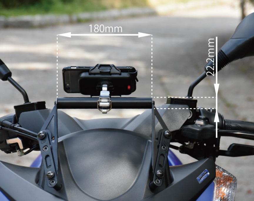 トリシティ125&トリシティ155のメーター上にスマートフォン(ナビ)をはじめとする、各種電子機器を装着可能にするマウントバーです。取り付け部分のパイプ径は一般的なハンドルバーと同じφ22.2を採用しているため、汎用性が高く様々なアクセサリーに対応します。取り付けは加工不要のボルトオン設計。ノーマルスクリーンとの同時装着に加え、ワールドウォークオリジナルスクリーンWS-17Tと併用することもできます。ステーは粘りのあるスチールを採用することで確実な耐久性を備えるとともに、レーザーカットによる肉抜き加工を施し軽量な仕上がりとなりました。また車体への固定を4点留めにしたことで近年主流の大型スマートフォンを取り付けた場合でも振動に強く良好な視認性を確保します。メーター上というハイマウントなポジションに設置することで、進行方向⇔メーター(計器類)⇔ナビ間での視線移動を最小限に抑えることが可能。ミラーマウントと比較して視線を深く下ろす必要がなくなるため、より快適なライディングを体感できます。 トリシティの専用パーツとして一から設計することで車体との親和性が取れたデザインと機能性を両立しました。日本製です。取り付け部分サイズ:180mm×φ22.2・材質:スチール 半艶黒塗装・付属品:取り付けボルト、マニュアル・取り付け時間:0.3h