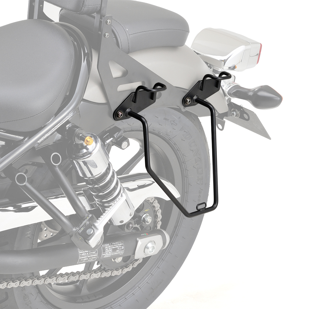 カラー:マットブラック材質:スチールバッグを装着しやすいように、ベルト掛け部分を一体化した形状を採用(サドルバッグハンガー不要)。荷物積載時にユーティリティーネットを掛けたり、多機能性を持たせたデザイン。簡易脱着可能。ベルト幅200mm前後の車両に最適。リアサス、リアアクスルに接触しにくい形状。取付簡単でさまざまなバッグをしっかり固定できる。※本商品を装着することにより、ご使用になるサドルバッグの大きさでヘルメットホルダーにヘルメットを掛けにくくなる場合があります。その場合、別売の75633/汎用ワイヤーケーブル500mmをご利用ください。※定期的にボルトの緩みを点検してください。※バッグ装着時は、全幅が増えるため、走行には十分注意してください