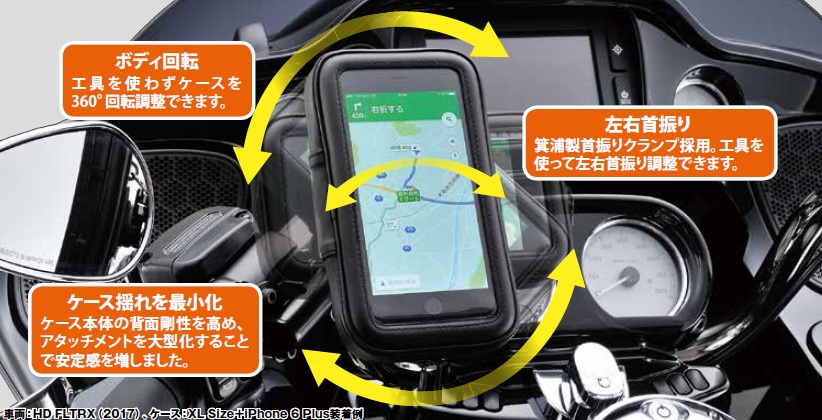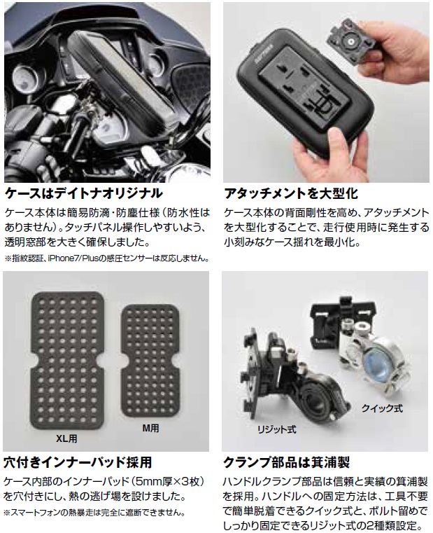 【iPhone7(アイフォン7)/iPhone6s(アイフォン6s)/iPhone6 Plus(アイフォン6プラス)収納可】穴付きインナーパッド、脱落抑止ストラップ標準装備。リジット取付タイプ(ボルト留めでしっかり固定できる)内寸:168×89×20(mm)デイトナオリジナル仕様のバイク用スマートフォンケース(簡易防滴・防塵仕様)。ケース本体の背面剛性を高め、アタッチメントを大型化することで、走行使用時に発生する小刻みなケース揺れを最小化。ハンドルクランプ部品は信頼と実績の箕浦製(カラビナホール付き首振りタイプ)を採用しました。ハンドルクランプ後のケースは工具を使わず360°回転調整、クランプからの脱着もワンタッチ。穴付きインナーパッド、脱落抑止ストラップ標準装備。ケースはデイトナオリジナル:ケース本体は簡易防滴・防塵仕様(防水性はありません)。タッチパネル操作しやすいよう、透明窓部を大きく確保しました。※指紋認証、iPhone7/Plusの感圧センサーは反応しません。アタッチメントを大型化:ケース本体の背面剛性を高め、アタッチメントを大型化することで、走行使用時に発生する小刻みなケース揺れを最小化。穴付きインナーパッド採用:ケース内部のインナーパッド(5mm厚×3枚)を穴付きにし、熱の逃げ場を設けました。※ スマートフォンの熱暴走は完全に遮断できません。クランプ部品は箕浦製:ハンドルクランプ部品は信頼と実績の箕浦製を採用。ハンドルへの固定方法は、ボルト留めでしっかり固定するリジット式。※所定の寸法範囲内であっても、機種の形状や仕様、ご使用になる保護ケースなどによっては収納できない場合があります。お客様の実機にて事前に十分ご確認ください。※商品可動部の調整、部品の組み付け、車体への取り付け、機種の装着・保護対策などは全て使用者のリスクにおいて行なってください。※ケース本体に防水性はありません。ケース透明窓の縫製部やファスナー部などからケース内部に浸水しますので、収納物の水濡れ対策は全て使用者のリスクにおいて行なってください。