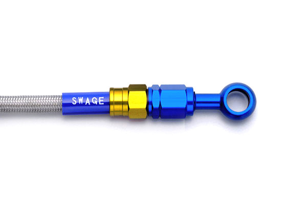 ホースカラー:クリアホース素材:ステンレスメッシュフィッティングカラー:ゴールド・ブルーフィッティング素材:アルミタイプ:ノーマル取り周りタイプブレーキフルード200mlが付属しています。スウェッジラインブレーキホースは、ホースの組付けを、純正品と同じく永久結合"カシメ方式"とすることで、継ぎ目の精度・安全性を飛躍的に向上させています。ホースエンドを両端ともフィッティング形状とし、脱着や角度調整が容易に行なえるとともに、バンジョーアダプターとの組み合わせにより幅広い対応性を実現。しなやかなのに硬く、しかも表面の摩擦抵抗が極めて小さいテフロンを引抜成型でチューブ化。これを材質、線径はもちろん編み方にまでこだわったステンレスメッシュで被覆し、さらに特注PVCコーティングにより、損傷や汚損から守ります。独自のスカート&ダンパー構造により、ホースが激しく振幅してもカシメ部が直接ホースを傷めることはありません。スウェッジラインは「ブレーキホースアッセンブリ」規定に基づく、引張、破裂、耐圧、ホイップ等の厳しい試験をクリアした、高い安全性を誇っています。SWAGE-LINE(スウェッジライン)に使用しているテフロンホース(俗に言うステンメッシュホース)は、純正ゴムホースに比べ膨張率が低く、伝達効率がアップ、ダイレクトなブレーキタッチが可能です。スウェッジラインブレーキホースは、ホースの組付けを、純正品と同じく永久結合"カシメ方式"とすることで、継ぎ目の精度・安全性を飛躍的に向上させています。ホースエンドを両端ともフィッティング形状とし、脱着や角度調整が容易に行なえるとともに、バンジョーアダプターとの組み合わせにより幅広い対応性を実現。しなやかなのに硬く、しかも表面の摩擦抵抗が極めて小さいテフロンを引抜成型でチューブ化。これを材質、線径はもちろん編み方にまでこだわったステンレスメッシュで被覆し、さらに特注PVCコーティングにより、損傷や汚損から守ります。独自のスカート&ダンパー構造により、ホースが激しく振幅してもカシメ部が直接ホースを傷めることはありません。スウェッジラインは「ブレーキホースアッセンブリ」規定に基づく、引張、破裂、耐圧、ホイップ等の厳しい試験をクリアした、高い安全性を誇っています。SWAGE-LINE(スウェッジライン)に使用しているテフロンホース(俗に言うステンメッシュホース)は、純正ゴムホースに比べ膨張率が低く、伝達効率がアップ、ダイレクトなブレーキタッチが可能です。